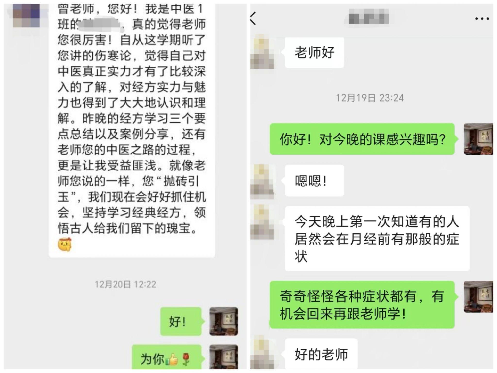 本次讲座受到全场学生的广泛好评。多名学生表示,讲座内容翔实、贴近临床,激发了他们学习中医的兴趣,坚定了他们学习中医学的信心!很多学生听后随即给曾老师发感言。